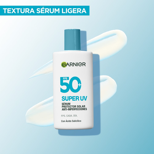 Descubrí el Protector Solar Super UV Anti-Imperfecciones de Garnier para proteger tu piel cada día. Combina FPS50+ y Ácido Salicílico para evitar los daños solares y reducir -66% de imperfecciones. Su fórmula regula la oleosidad por 12 horas y disminuye el brillo sin dejar sensación grasosa. Está especialmente diseñado para pieles grasas o con tendencia al acné, ofreciendo una protección eficaz de uso diario. Incorporalo a tu rutina Anti Imperfecciones Dermatológicamente probado, vegano y Cruelty Free.