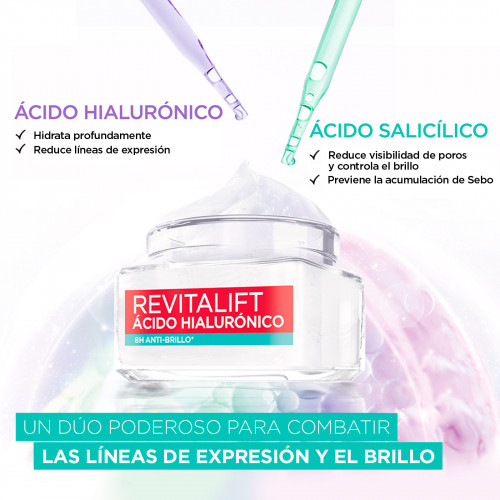Conocé el nuevo Gel Crema Revitalift Ácido Hialurónico: una crema hidratante con textura ultra ligera, refrescante y de rápida absorción. Su fórmula resulta en un poderoso dúo, al combinar Ácido Hialurónico, activo antiedad que hidrata intensamente la piel, rellenando líneas de expresión; y Ácido Salicílico, activo anti-brillo que controla el sebo y reduce la visibilidad de los poros. Ideal para pieles mixtas a grasas.