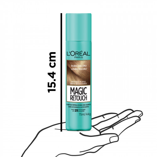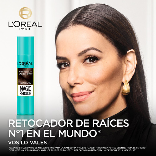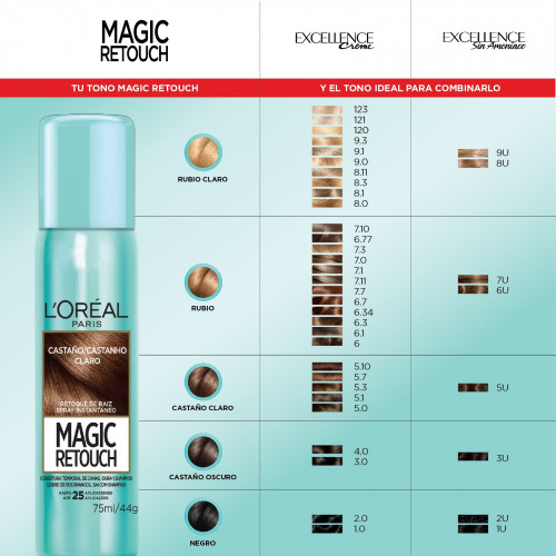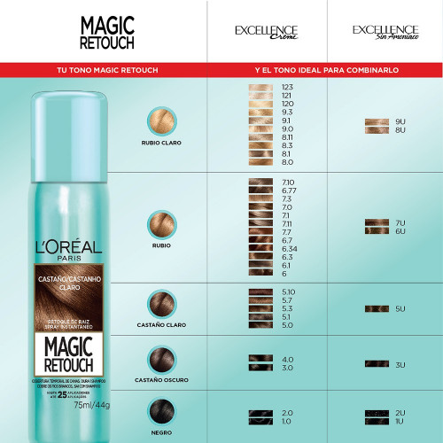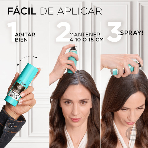 ¡Volvió Magic Retouch de L´Oreál Paris! El retocador de raíces N1 en el mundo. Cubre las canas y raíces instantáneamente sin mezclarse ni ensuciar. La fórmula no es pegajosa, no contiene alcohol, amoníaco ni peróxido y está hecha para todo tipo y textura de cabello. Es perfecto cuando estás entre sesiones de color o visitas al salón, ofreciendo resultados impecables: • Dura hasta el próximo shampoo. • No requiere mezcla ni revelador. • Fabricado sin colorantes sintéticos. • Viene en 5 tonos de secado rápido. • Funciona en cabello sintético. • Sin formaldehído, sin aluminio y sin aceite mineral.