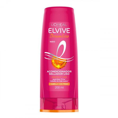 ¿Pelo con Frizz? El acondicionador Elvive Dream Liso potencializado con [Keratina V* + AHA], desenreda y alinea la fibra capilar, dejando el pelo sin frizz por 72H y 4x más suave.