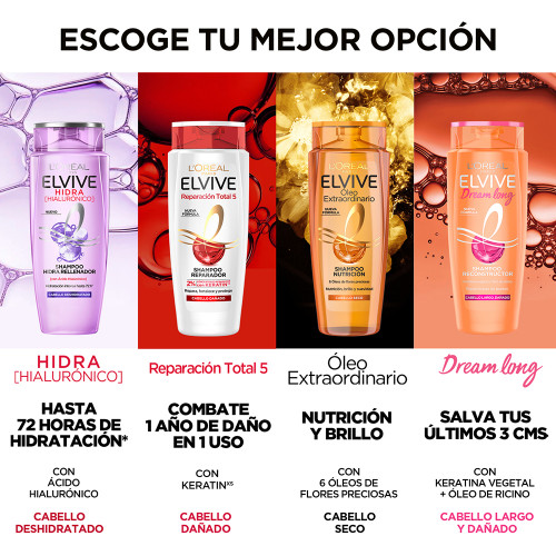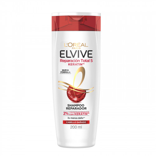 Shampoo Elvive Reparación Total 5 para cabello dañado Detalles de Producto ¿Sientes que tu cabello está dañado? Nuestro Shampoo Reparador, ahora con 2% de concentrado reparador con KERATINxs y con efecto Anti-Sal°, instantáneamente repara, fortalece y protege la fibra capilar, para transformar el cabello dañado en un cabello sedoso y brillante.