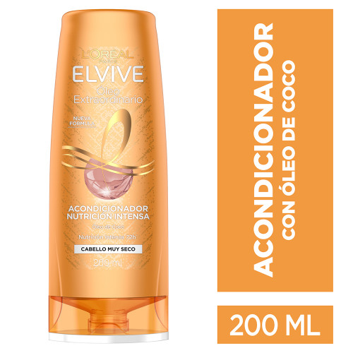 ¿Cabello muy seco? Tu cabello necesita una nutrición intensa. Nuestro Acondicionador Nutrición Intensa, con Óleo de Coco y con efecto Anti-Sal°, penetra en la fibra capilar para transformar tu cabello de forma extraordinaria.. Elvive Óleo Extraordinario Coco para cabello muy secotiene como beneficio: 1. Suavidad y brillo increíble. 2. Disciplina y control del frizz. 3. Aplicar en puntas y largos sobre el cabello mojado después del shampoo ELVIVE NUTRICIÓN INTENSA, dejar actuar y enjuagar. Para mejores resultados, utilizar los otros productos de la línea ELVIVE ÓLEO EXTRAORDINARIO COCO. Evítese el contacto con los ojos. En caso de contacto con los ojos, enjuague inmediatamente. Manténgase fuera del alcance de los niños. Si observa alguna reacción desfavorable Suspenda su uso.