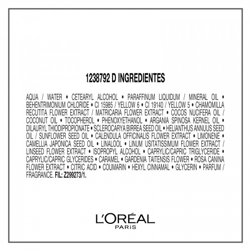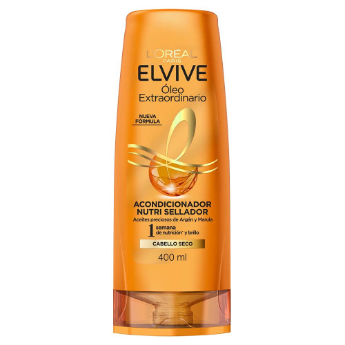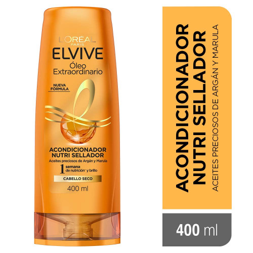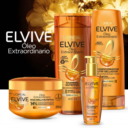 ¿Cabello seco? Tu cabello necesita una nutrición extraordinaria. Nuestro Acondicionador Nutrición, con 6 Óleos de Flores Preciosas y con efecto Anti-Sal°, transforma tu cabello de forma extraordinaria.. Elvive Óleo Extraordinario Nutrición Universal para todo tipo de cabellotiene como beneficio: 1. Nutrición y brillo intenso. 2. Excepcional suavidad y ligereza. Aplicar en puntas y largos sobre el cabello mojado después del shampoo ELVIVE NUTRICIÓN, dejar actuar y enjuagar. Para mejores resultados, utilizar los otros productos de la línea ELVIVE ÓLEO EXTRAORDINARIO. Evítese el contacto con los ojos. En caso de contacto con los ojos, enjuague inmediatamente. Manténgase fuera del alcance de los niños. Si observa alguna reacción desfavorable